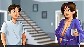 In milfy city, big tits teen violet with perfect big ass massages and gives tit job to big cock guy until he cums on her boobs.