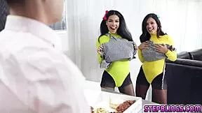 stepbrother, wanna taste your hot brunette stepsister's pussy in bathroom threesome?