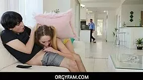 Stepsiblings Suck and Fuck in Wild Orgy Behind Stepdad in Living Room