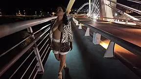 damn luscious hairy milf's huge natural tits bounce braless on bridge with no panties flashing beaver?